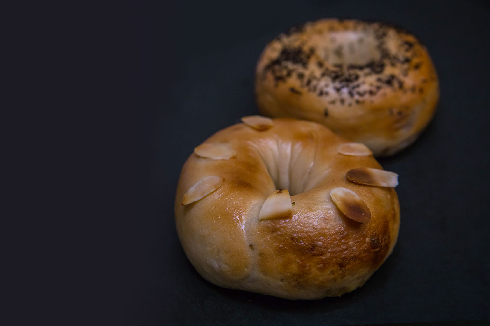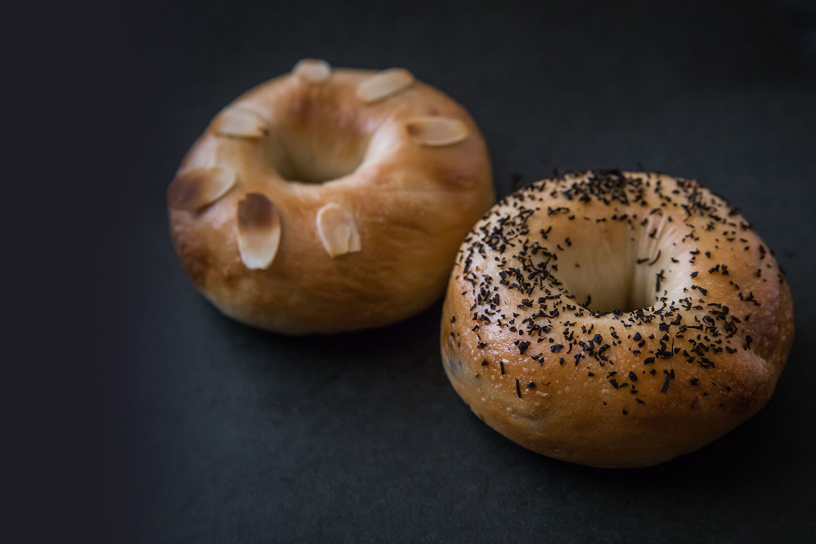 生地にミルクキャラメルを練り込み、上にスラッシュアーモンドをのせた甘いベーグルです。 NEW!!